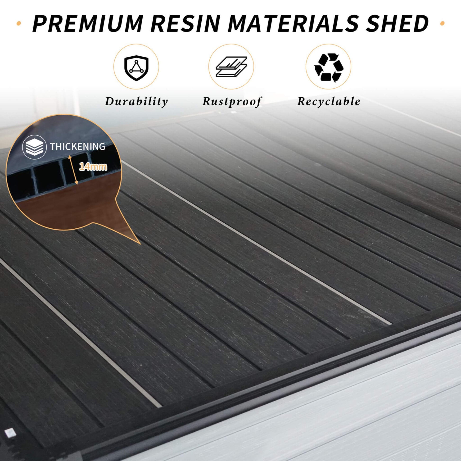 - Built to last with heavy-duty 14mm double-layer polypropylene resin, this shed is fully waterproof, rust-proof, and designed to stay maintenance-free for years to come—no painting or repairs required!