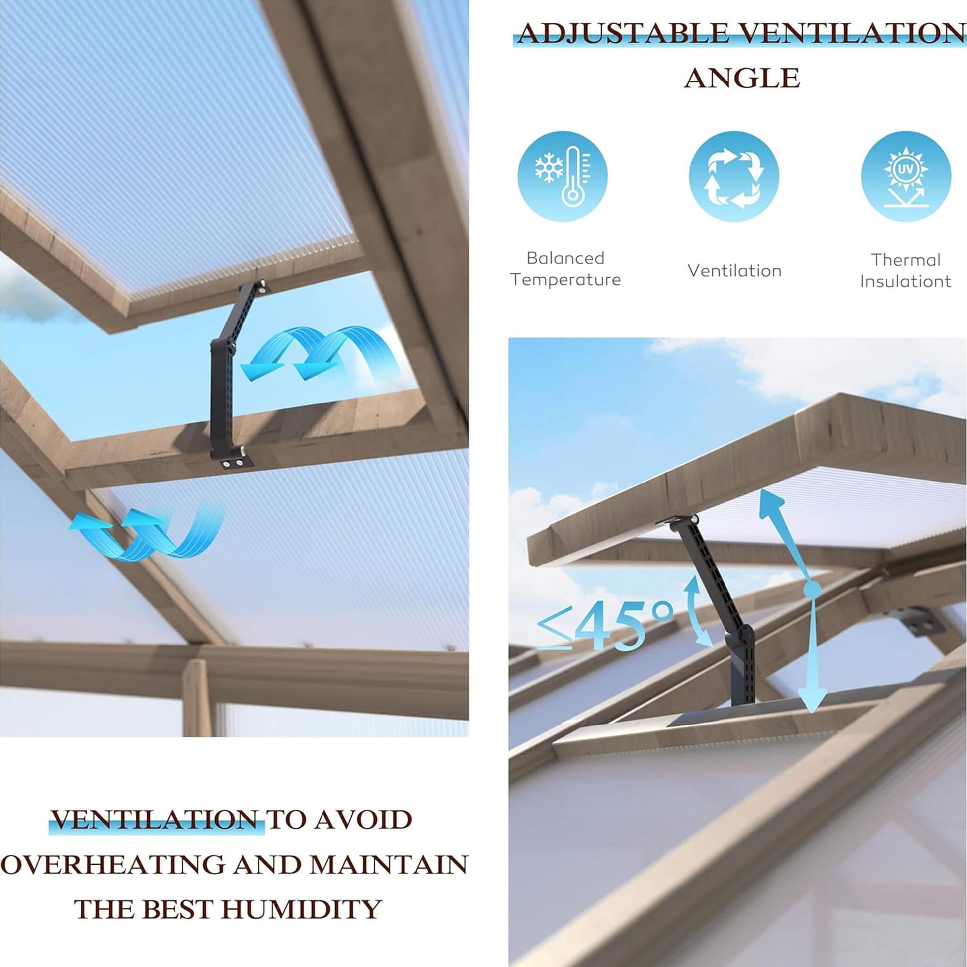 Give your plants the VIP treatment they deserve. This greenhouse features high-quality 6mm thick polycarbonate panels that provide superior insulation compared to standard models. These multi-layer panels work hard to retain heat during cooler months while shielding your delicate greens from harsh UV rays. When the summer sun gets intense, the adjustable roof vents become your best friend. You can easily prop them open up to 45 degrees, allowing fresh air to circulate and regulating humidity levels so your plants thrive in the perfect microclimate.