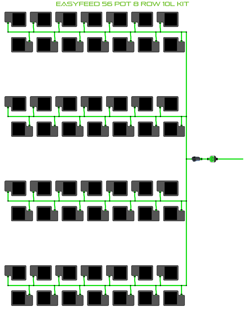The ALIEN EasyFeed 56 Pot 8 Row Kit is available in 4 pot sizes. Easy to configure and assemble with advanced features and setup options including the ability to create an aisle in the middle of rows for complete plant access, grow 56 plants to perfection while bottom-feeding with scheduled dry-backs with this ALIEN EasyFeed Kit!